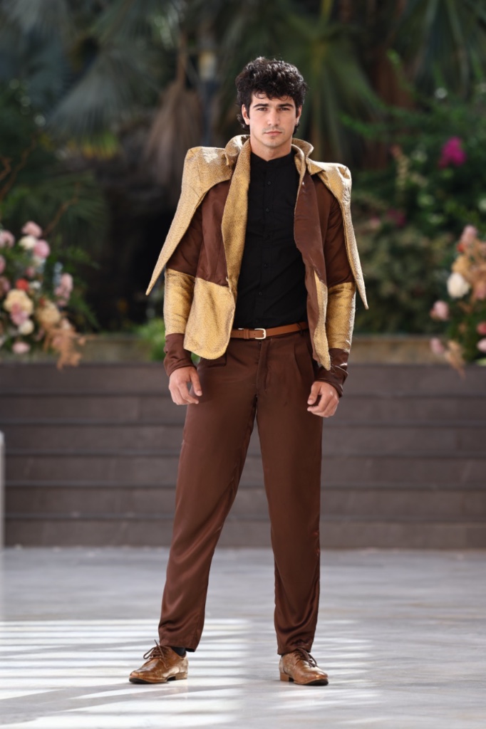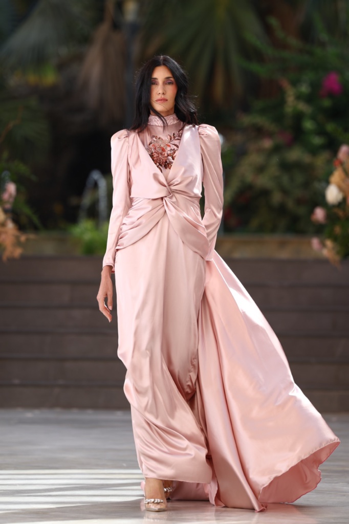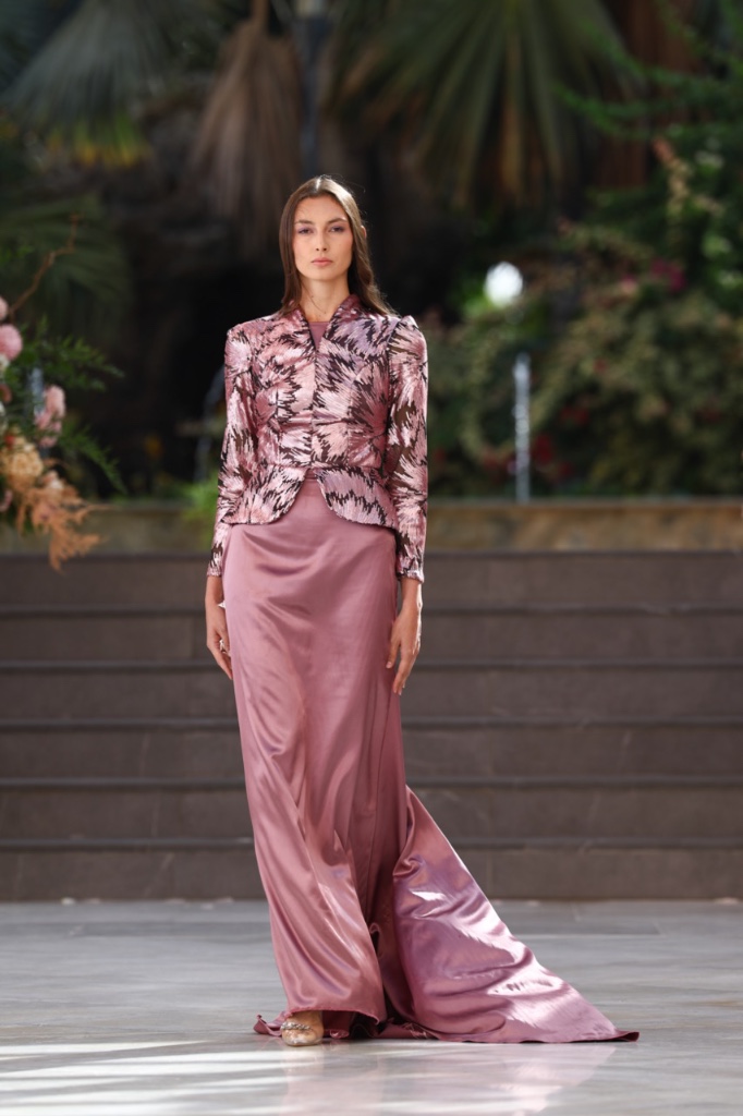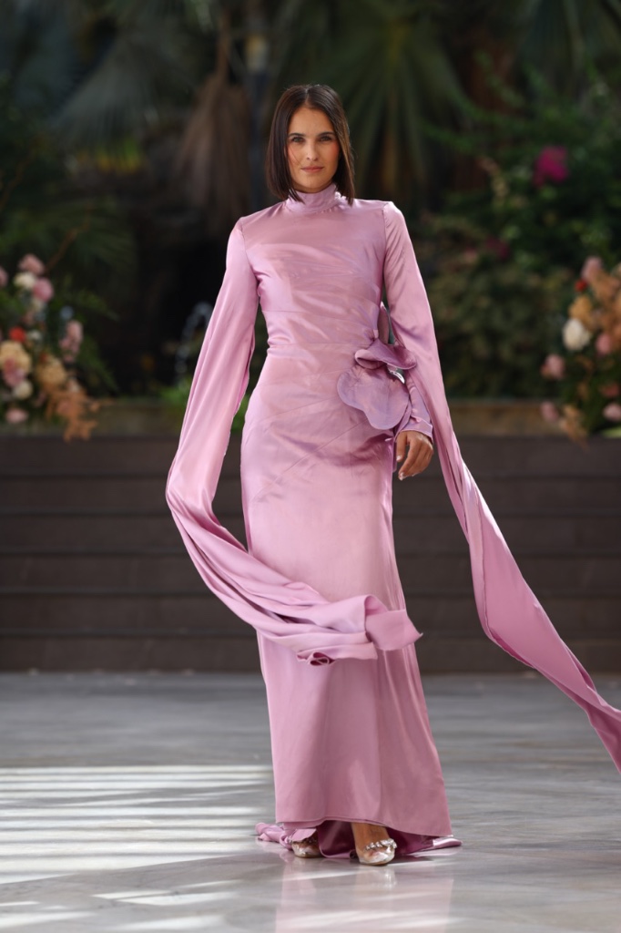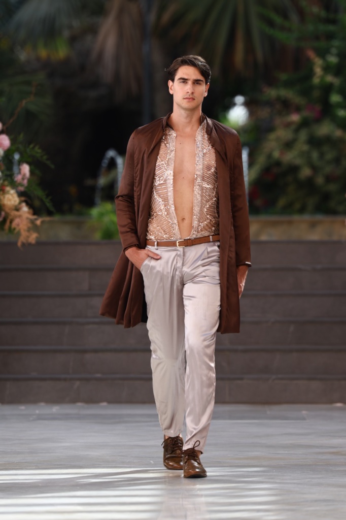 Cada diseño se concibe como un fragmento de recuerdo que se materializa en sedas satinadas, transparencias etéreas y volúmenes cuidadosamente estructurados. Las siluetas femeninas y masculinas dialogan entre sí en un equilibrio entre romanticismo contemporáneo y estética surrealista, donde los tejidos parecen fluir y transformarse como si el tiempo se derritiera sobre el cuerpo. La paleta cromática —compuesta por blancos nacarados, lavandas suaves, rosas antique, tonos champán, marrones desierto y negros profundos— evoca diferentes estados emocionales vinculados al amor, la nostalgia y la eternidad.