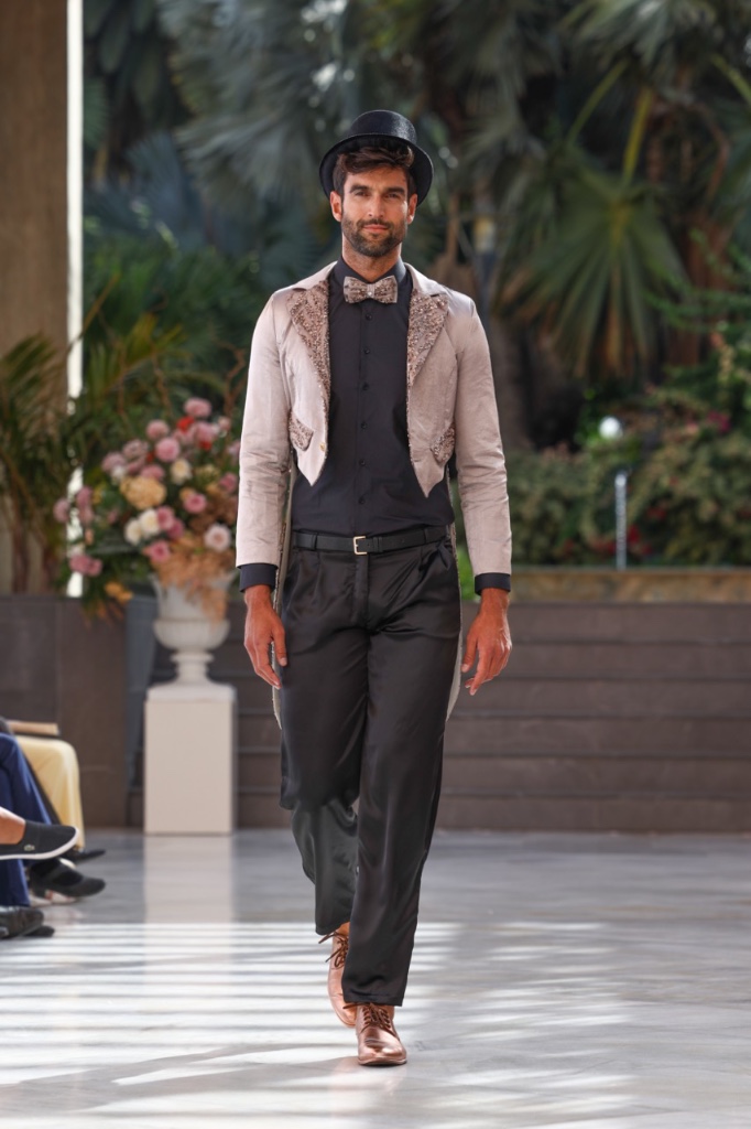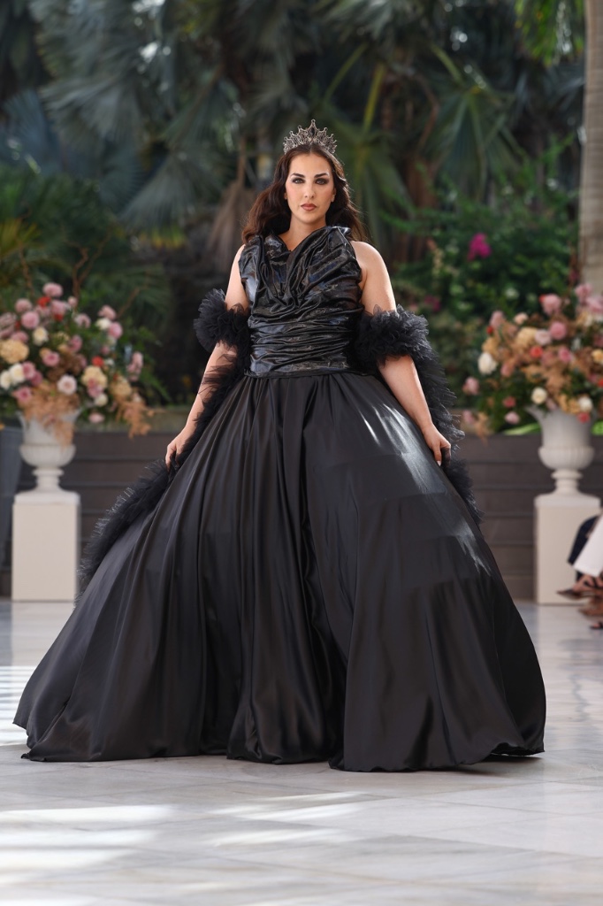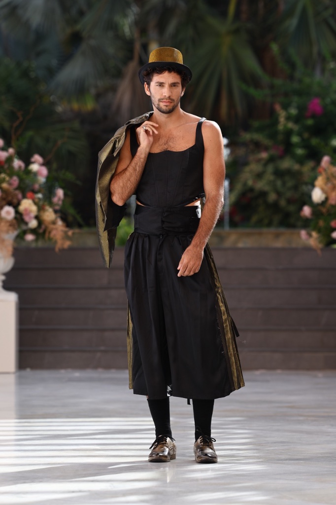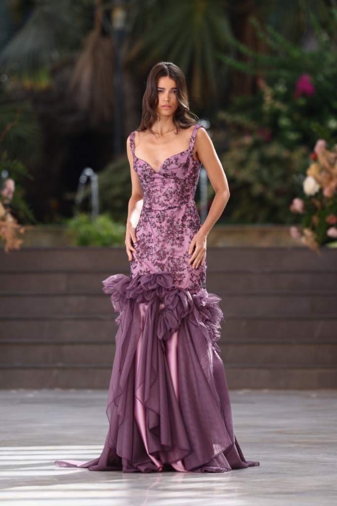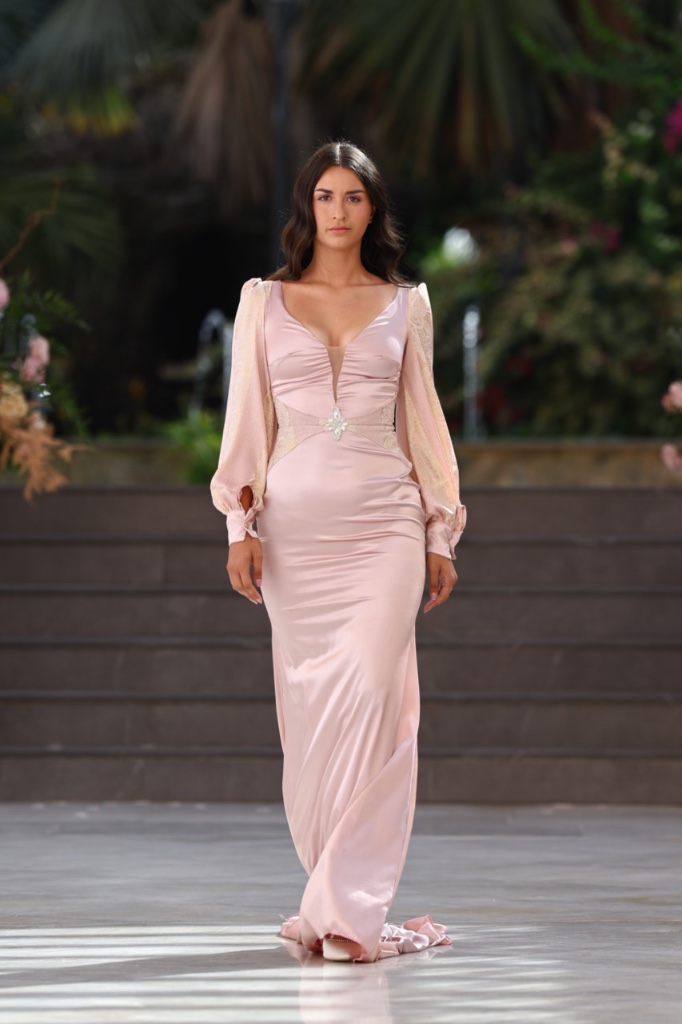 Cada diseño se concibe como un fragmento de recuerdo que se materializa en sedas satinadas, transparencias etéreas y volúmenes cuidadosamente estructurados. Las siluetas femeninas y masculinas dialogan entre sí en un equilibrio entre romanticismo contemporáneo y estética surrealista, donde los tejidos parecen fluir y transformarse como si el tiempo se derritiera sobre el cuerpo. La paleta cromática —compuesta por blancos nacarados, lavandas suaves, rosas antique, tonos champán, marrones desierto y negros profundos— evoca diferentes estados emocionales vinculados al amor, la nostalgia y la eternidad.